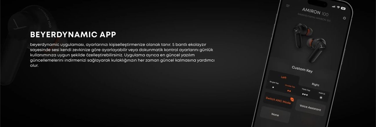beyerdynamic’in uzun yıllara dayanan akustik mühendisliği deneyimini modern kablosuz teknolojilerle bir araya getiren AMIRON 100, üstün ses kalitesi, gelişmiş gürültü engelleme ve konforlu kullanım özellikleri ile öne çıkan premium true wireless kulak içi kulaklık modelidir. Günlük kullanım, seyahat, çalışma veya mobil müzik dinleme deneyimi için tasarlanan bu model, kompakt tasarımı ve güçlü teknik özellikleri sayesinde her ortamda yüksek performans sunar.