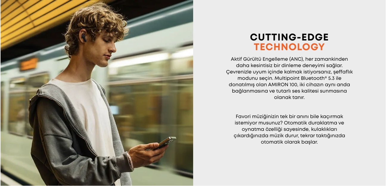 Bluetooth 5.3 bağlantı teknolojisi ile donatılan AMIRON 100, hızlı ve stabil kablosuz bağlantı sunarken Multipoint bağlantı özelliği sayesinde aynı anda birden fazla cihaz ile eşleşebilir. Böylece akıllı telefon, tablet veya bilgisayar arasında kolayca geçiş yapabilirsiniz.