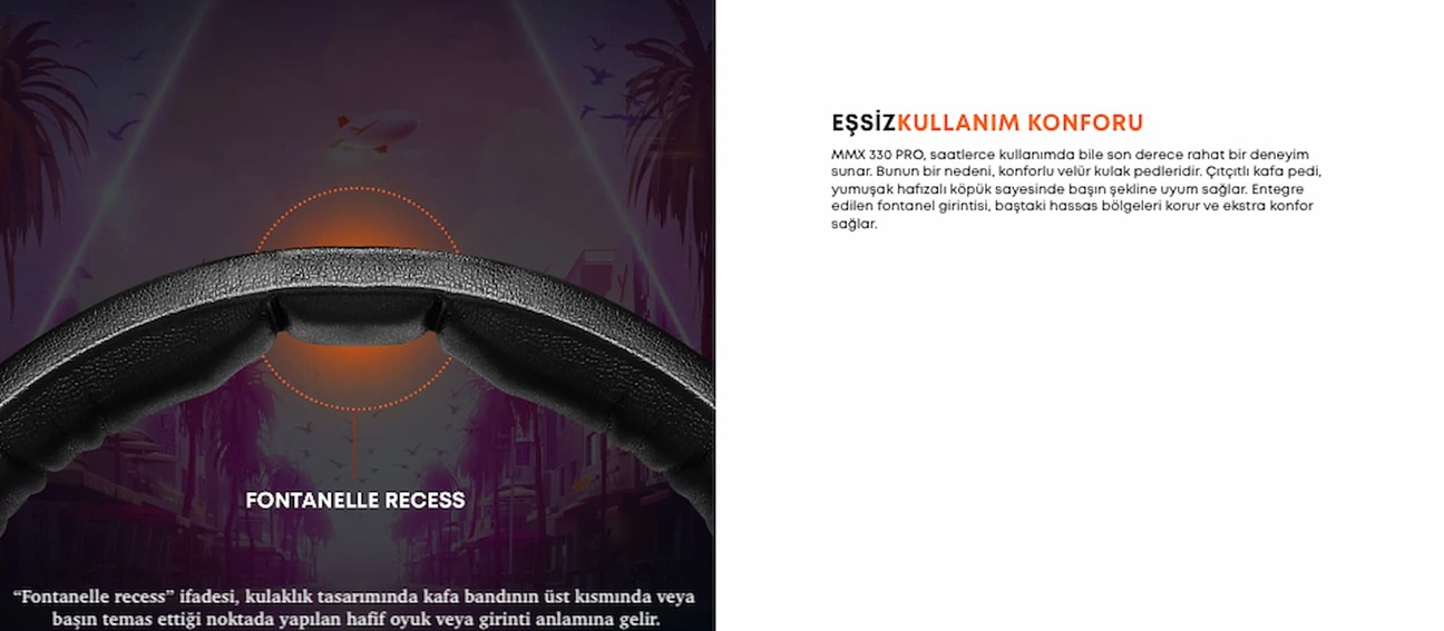 MMX 330 PRO, uzun süreli kullanım düşünülerek ergonomik şekilde tasarlanmıştır. Nefes alabilen velur kulak pedleri, kulak çevresinde terlemeyi azaltırken yumuşak yapısıyla maksimum konfor sunar. Hafıza köpüğü destekli kafa bandı ise basıncı dengeli şekilde dağıtarak uzun oyun seanslarında bile rahatsızlık oluşmasını engeller.